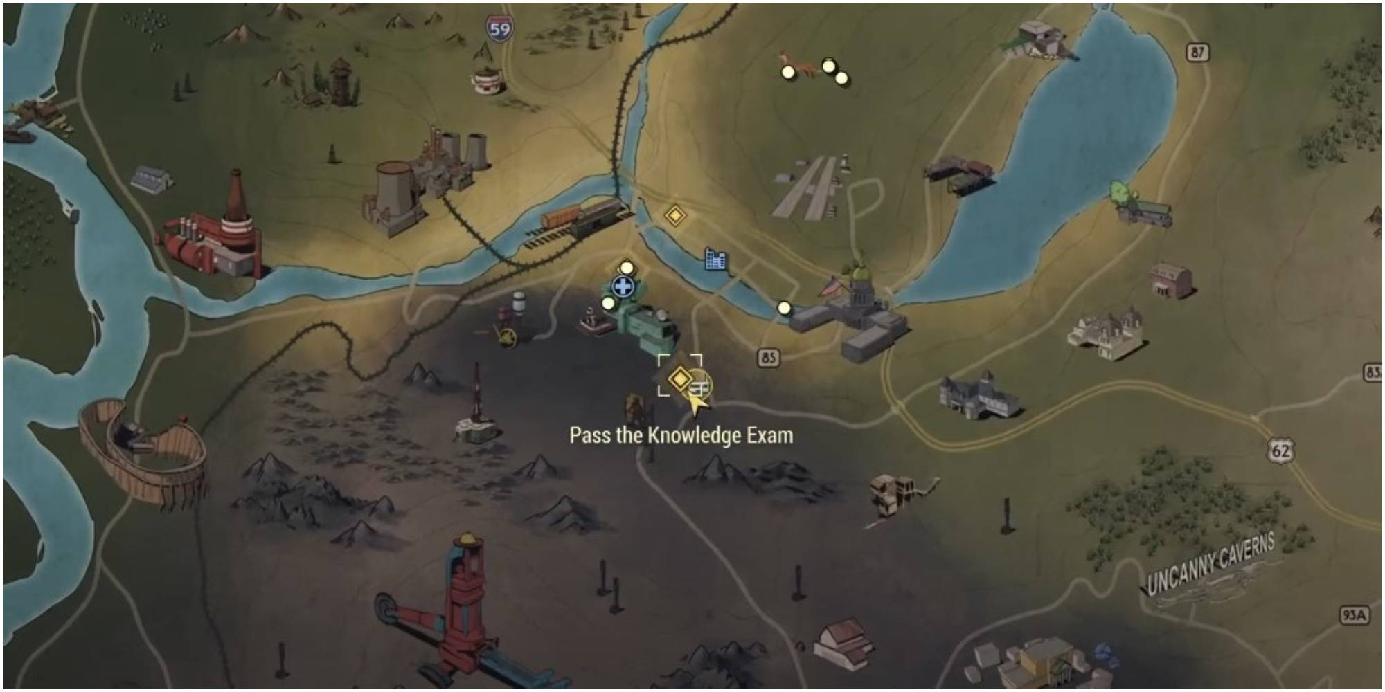 In the back of the fire station youll find three terminals containing the Knowledge Exam that you have to pass to join up. One of your early quests in Fallout 76 will task you with completing a knowledge exam for the Fire Breathers within their training system. Go to the exam room at the bottom floor of the building.